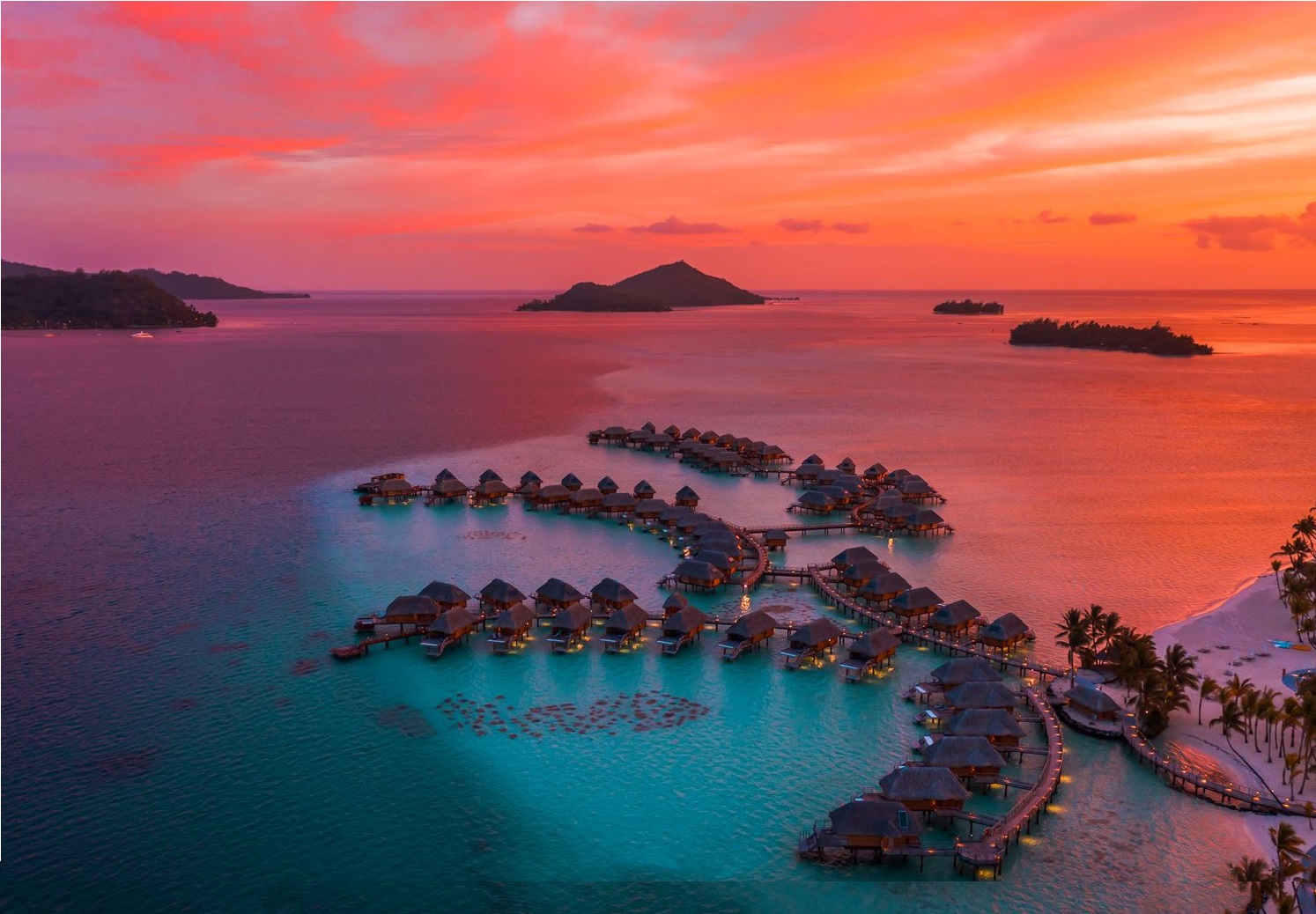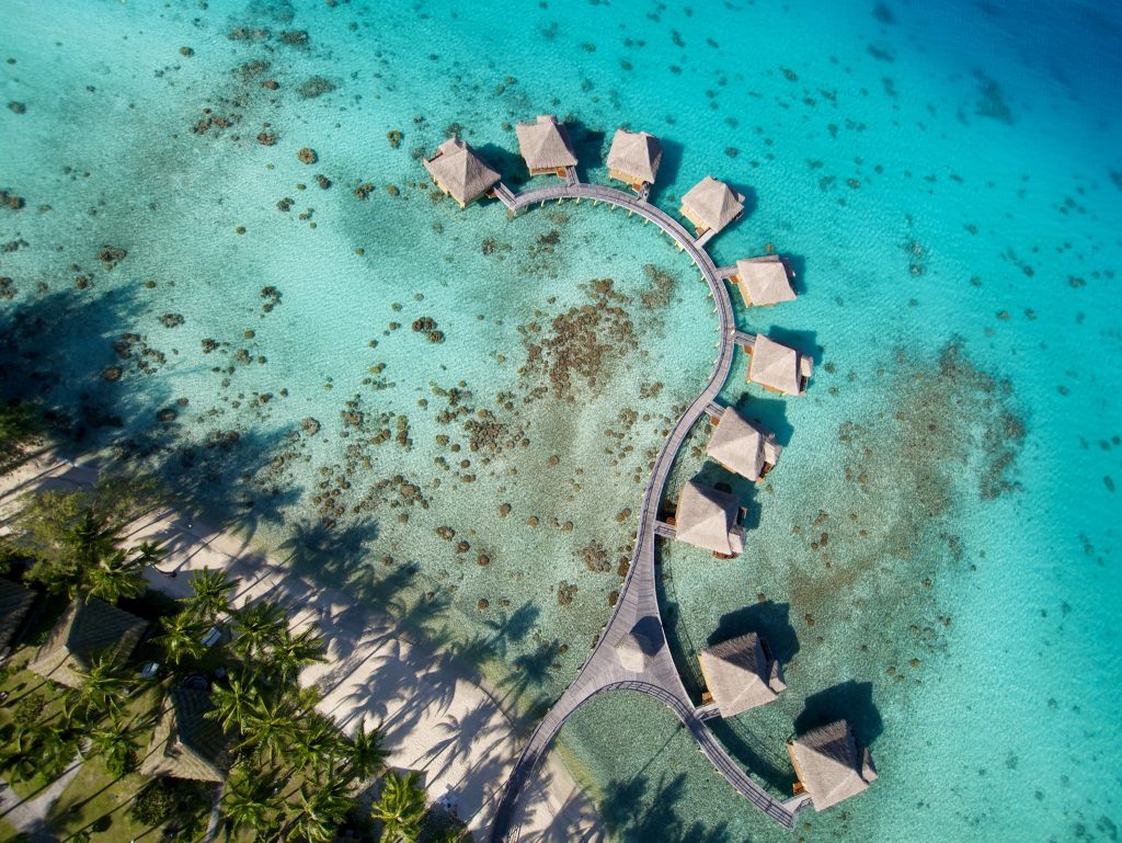 De acceso privado en avión, el complejo está compuesto por 35 villas, cada una con su propia playa y piscina privada, restaurantes, un spa polinesio, un bar con vistas panorámicas a la laguna, tiendas y una Ecostation. Un escenario que se completa con la visita habitual de tortugas, mantas y aves exóticas de todo tipo a los pies de tu bungalow.