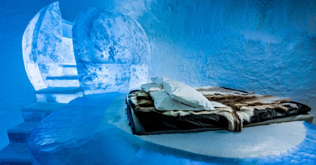 Un alojamiento de hielo efímero, porque dura lo que dura el hielo. Cuando llega la primavera y las suites de invierno se derriten, una parte del hotel sigue en pie para que los visitantes puedan disfrutar de este alojamiento durante todo el año. Cada habitación está tallada a mano por artistas de todo el mundo de diferentes disciplinas. Cada suite es única y nunca antes se había creado igual.